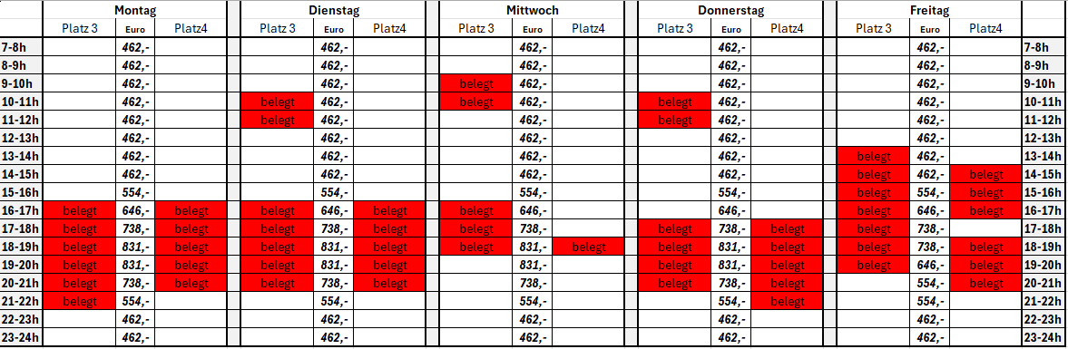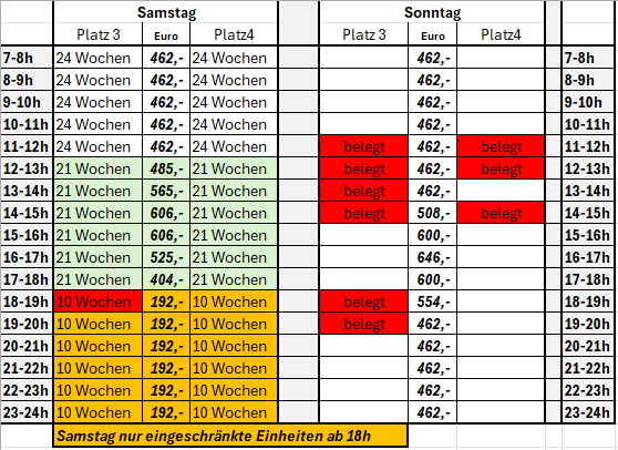 Wir planen derzeit, dass die Abos am Mittwoch, den 15. Oktober 2025 beginnen und am Dienstag, den 31. März enden. Das sind 24 Wochen/Einheiten an den Wochentagen. Die Abopreise sind der Liste zu entnehmen. Die rot markierten Abostunden sind schon vergeben.